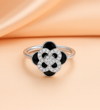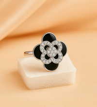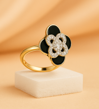 Elevate your style with this exquisitely crafted floral ring, featuring a timeless clover-inspired design. The center is adorned with a brilliant diamond cluster that sparkles beautifully, framed by glossy black enamel petals for a striking contrast. Set on a sleek, polished band, this ring blends modern elegance with classic luxury.