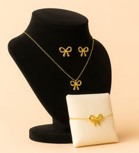 This elegant gold bow jewelry set is a perfect blend of charm and sophistication. Featuring a matching necklace, stud earrings, and a delicate bracelet, each piece showcases a beautifully crafted bow motif symbolizing grace and femininity. Designed with a polished gold finish, this coordinated set adds a refined, luxurious touch to both everyday outfits and special occasions. A timeless choice for modern elegance and thoughtful gifting.
